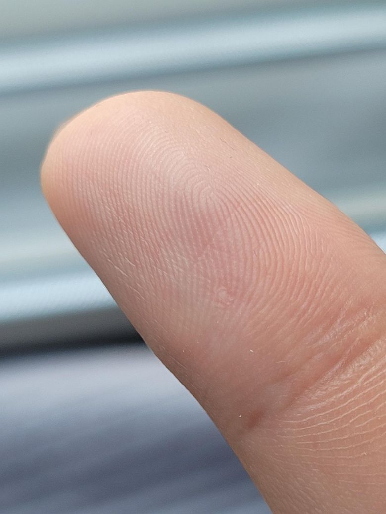 지금 보이는 병변은 작은 물집이나 마찰로 인한 각질 손상, 또는 아주 초기의 표재성 수포 가능성이 더 커 보입니다. 특히 볼록하지 않고, 표면이 매끈하며, 뜯기지 않는다면 사마귀 소견과는 거리가 있습니다.