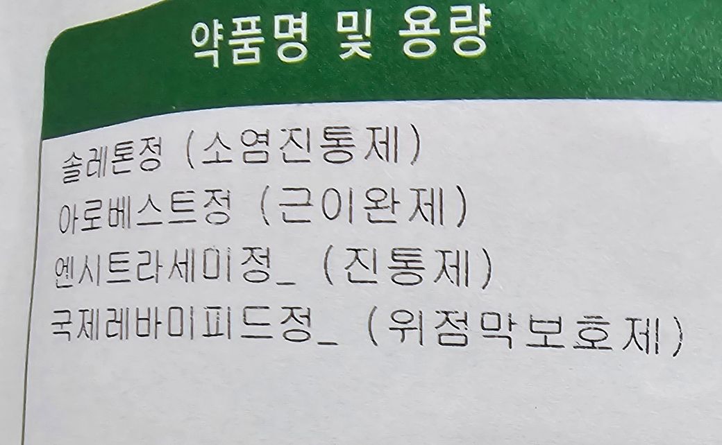 솔레톤정, 아로베스트정, 엔시트라세미정, 국제레바미피트정 먹고 있어요