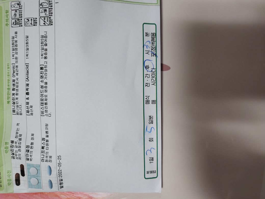 첫번째 처방약은 곰실린캅셀(항생제), 알마겔정(위장약), 아나프록스정(소염진통제)이고