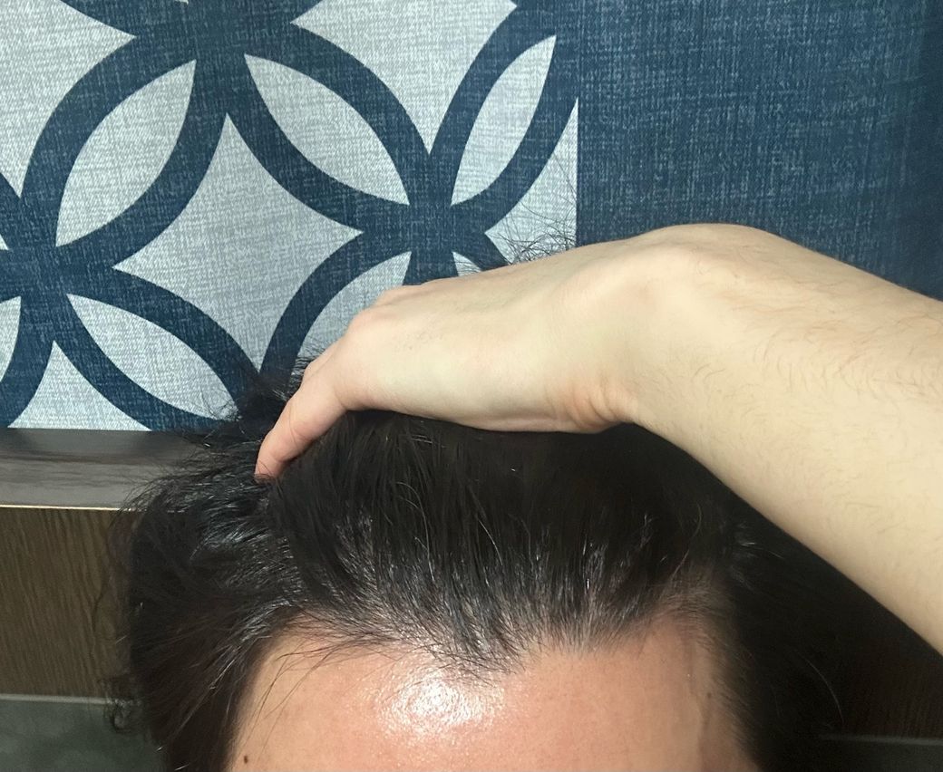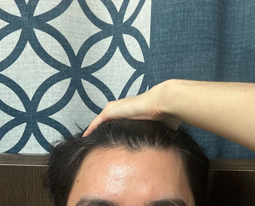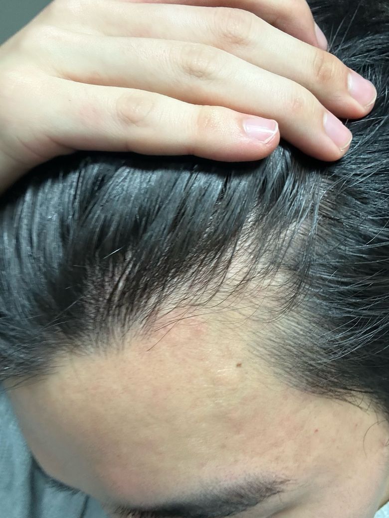 사진상으로는 전두부 중앙 밀도는 비교적 유지되어 있고, 측두부 헤어라인이 약간 후퇴된 형태입니다. 이마 양측이 대칭적으로 들어간 전형적인 M자 형태라기보다는, 원래 이마 모양이 약간 각진 경우와도 구분이 필요해 보입니다. 다만 오른쪽 측두부가 상대적으로 더 들어가 보이는 점은 초기 남성형 탈모(androgenetic alopecia)의 가능성을 완전히 배제하기는 어렵습니다.