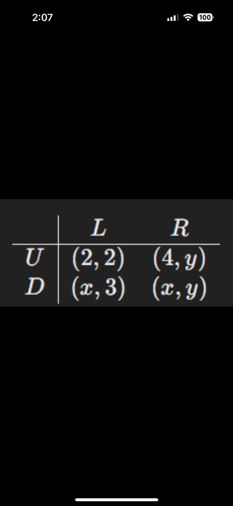 (D, L)이 각 기업의 우월전략에 의해 만들어지는 균형이 되도록 하는 xxx와 yyy의 범위는 다음과 같습니다: x>4x > 4x>4 y<3y < 3y<3