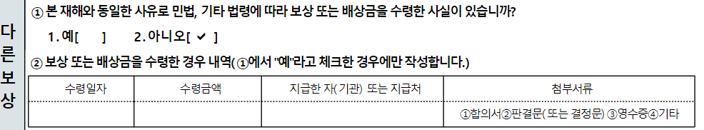 동일한 재해로 인해 산재보험이 아닌 보험금을 받았다면 1번에 ‘예’에 표시해야 합니다.