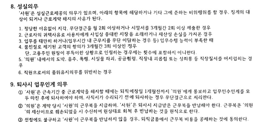 +계약서에 근무복 지급 내용으로 지급해야하는데