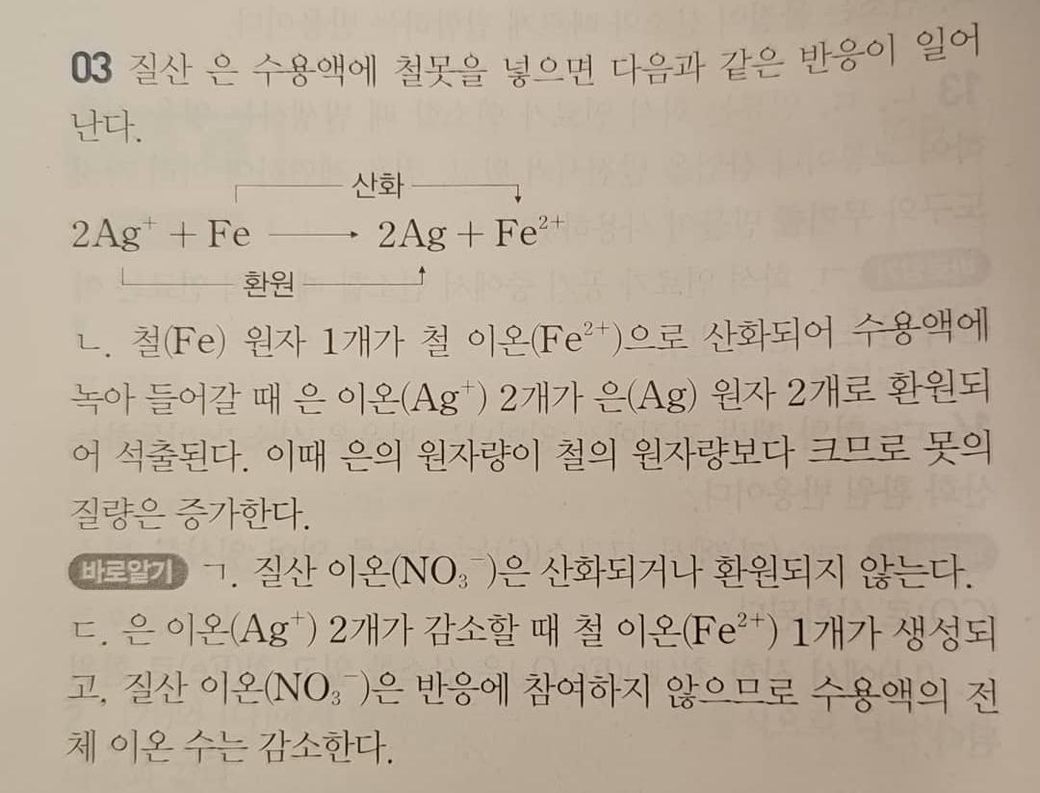 이 반응에서 은 이온의 원자량이 철의 원자량보다 크기 때문에, 은 이온이 은으로 환원되는 과정에서 전체적인 반응물의 질량은 증가하지 않습니다. 이는 전자의 이동이 원자의 원자량을 변경하지 않기 때문입니다. 만약 원래 문제의 문장이나 해설에서 혼동이 있었다면, 그 부분은 오해의 소지가 있습니다.