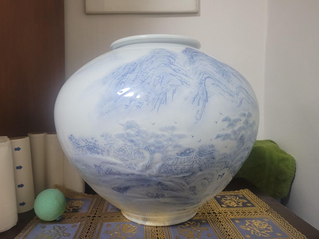 해암 정태석은 우리나라 1세대 도예가로 청화백자와 달항아리 등 독창적인 도자기 작품을 제작한 명장입니다. 그의 도자기는 장작가마를 이용한 전통 방식으로 제작되었습니다. 사진은 달항이라 청화백자입니다. 달항아리는 둥근 보름달과 닮은 형태를 말합니다. 그는 1998년 작고했습니다.