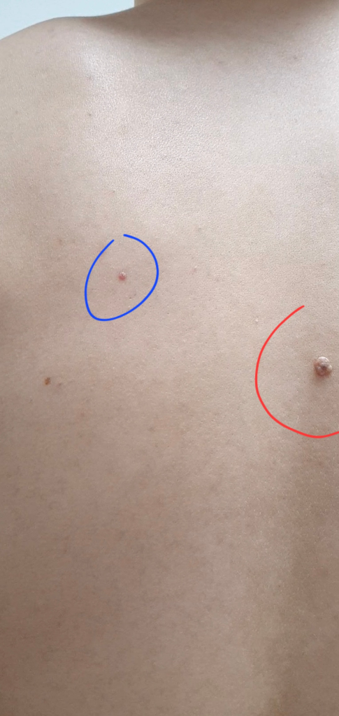 사진이 조금 더 크면 좋겠지만 두 병변 모두 양성질환으로 보이며, 오른쪽 큰 병변은 진피내모반이라고 하여 점의 한 종류입니다. 왼쪽 병변도 비슷한 종류입니다.