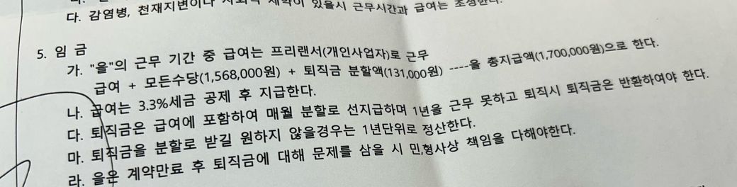 학원에서 일하는중이고 3.3프로 떼는 프리랜서 계약서를 썼는데 월급에 퇴직금이 포함되어있고 1년 안채울시 이걸 뱉어내고 그만둬야 한다는데 이런법도있나요..?