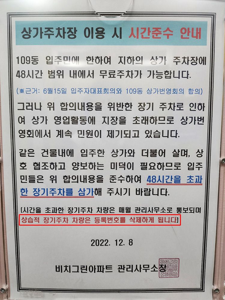 그런데 얼마전 부터 이런 공지서가 붙었습니다. 하지만, 맨 밑줄에 있는 '상습적 장기주차 차량은 등록번호를 삭제하게 됩니다'라는 상식 밖의 꼬릿말을 붙였습니다.