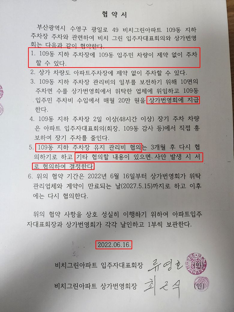 이에 주민들과 새로 부임한 아파트입주자대표(이하B)와 갈등이 벌어지고 논의가 벌어졌으며 주민들은 구청에 민원을 넣는 일이 있었습니다. 그런데 구청에서는 구청 허가 없는 주차 차단기와 장애물에 대해 철거 명령을 내렸지만 B는 아파트 주민의 의견을 모아 주차 차단기 지속 운용 및 상가 주차장(지하 주차장)에서 아파트 주민은 48시간 연속 주차를 허용했습니다.