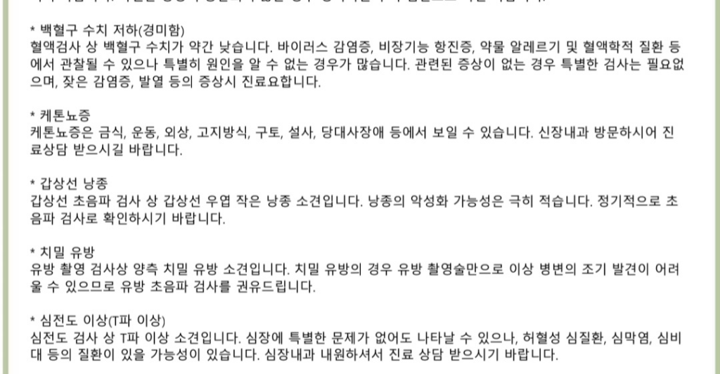 금식과 구토로 탈수가 되어 케톤뇨가 나온 겁니다. T파 이상은 심전도도 확인해 봐야 하지만 평소 운동시 통증이 없다면 무시하시기 바랍니다.