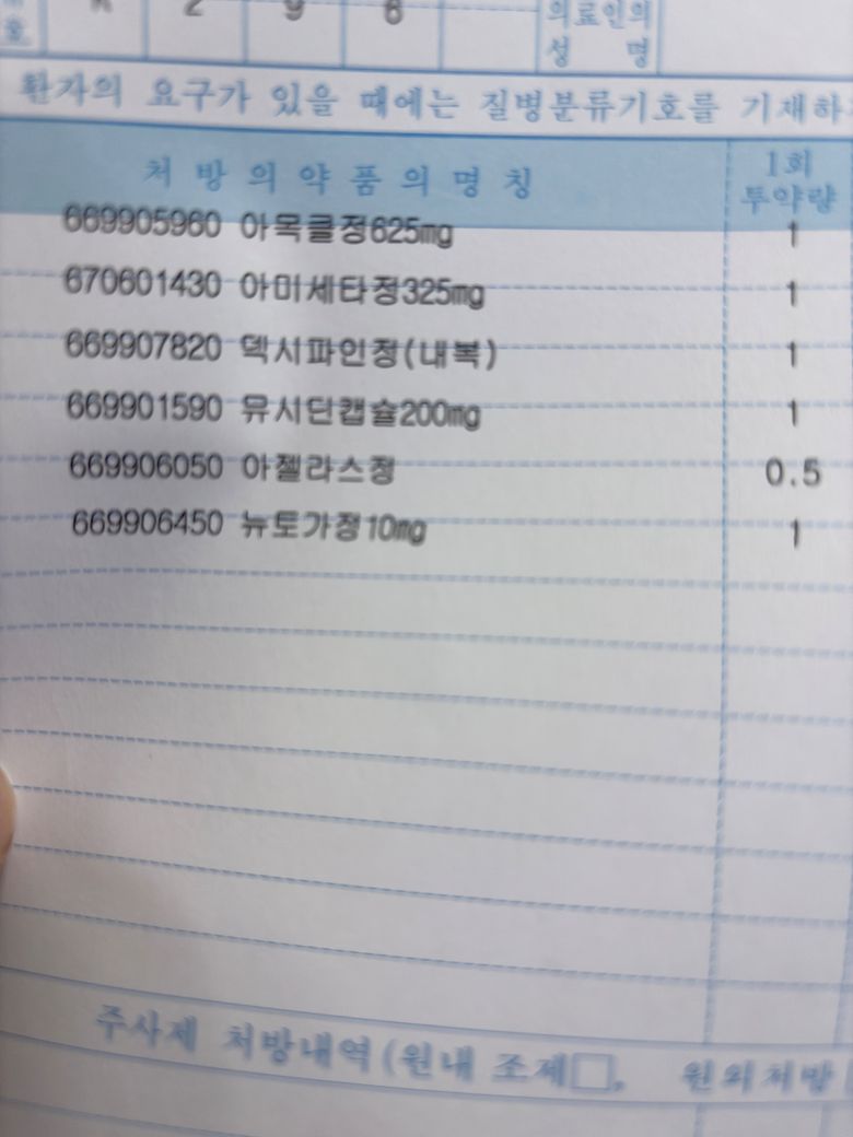 아목클정, 뉴토가정, 덱시파인정 3개만 먹어도 될까요. 열은 없어서 아세트아미노펜 뺐고요. 아젤라스는 항히스타민제인데 알러지 없어서 그런데.. 뮤시딘도 가래는 없어서..