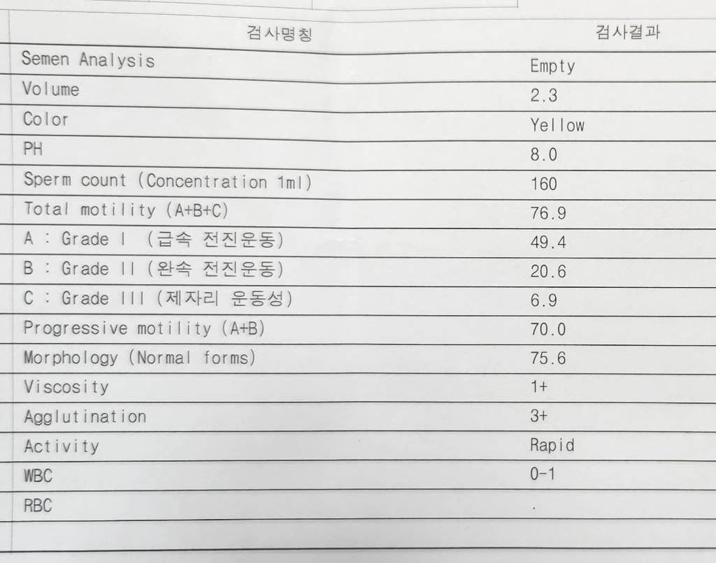 Sperm count (Concentration 1ml): 1ml의 정액 내에 있는 정자의 수를 말합니다. 정상 참조 범위는 보통 15백만/ml 이상입니다. 이 결과는 160백만/ml로 매우 높은 편입니다.