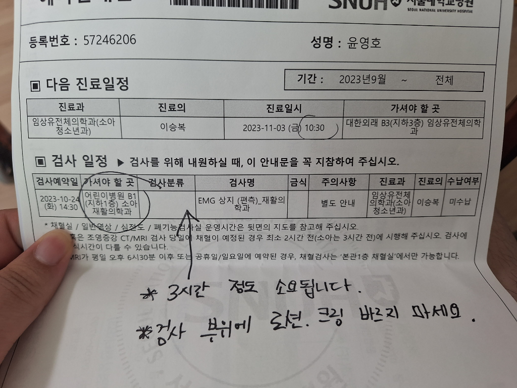 아직은 정확한 병명이 나온 것은 아니구요. 회백질의 이상, 정신 지체 등의 진단명을 주신 상태입니다. 검사는 근육 전도 검사입니다. 근육의 이상으로 다리에 힘이 빠지는 상태인지 확인을 하기 위한 검사입니다.
