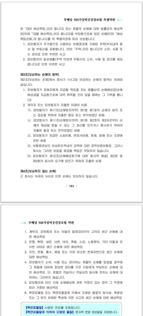 현재 가입하신 NH 가성비굿건강보험의 일상생활배상책임 특약은 '피보험자가 소유하거나 관리/사용하는 주택에서 발생한 누수 사고'만 보장하도록 되어 있습니다. 질문자님은 실거주자이지만 주택 소유자가 아니므로 약관상 피보험자 범위를 충족하지 않아 보상 대상이 되지 않는다는 고객센터의 답변은 약관 기준상 맞는 답변입니다. 누수 보장을 원할 경우 부모님 명의로 일상생활배상책임 보험이나 주택보험을 가입하는 것이 필요합니다. 답변이 도움이 되었길 바랍니다.