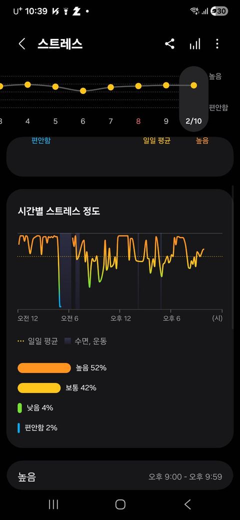 아뇨, 저는 보통도 잘 나오는 편이에요. 스트레스와 항상 비례하진 않는데 대개 점심에 평화로울 때에는 높음이 아닌 보통이나 낮음도 나오더라고요, 꼭, 높음 이상만 나오도록 설정된 건 아닌 듯 하니 참고하시기 바랍니다~!