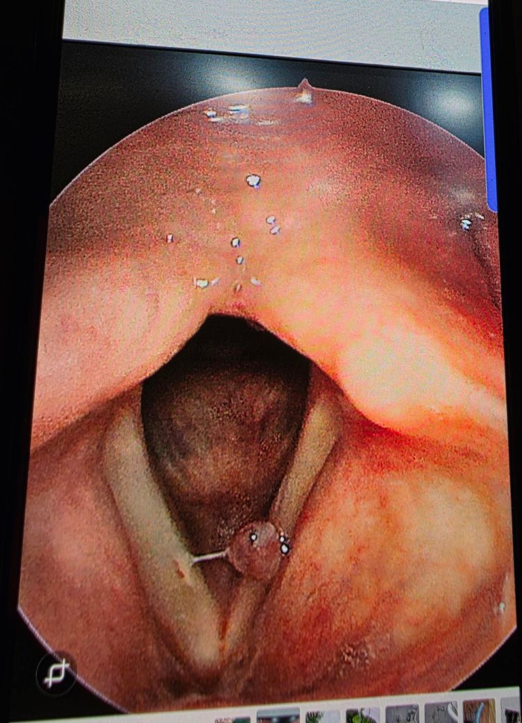 성대 결절이라고 불리는 병변인데 사진상 추정할 때 0.5c-1cm 정도의 크기로 보이며 표면 상피가 뷸균일하여 조직검사가 필요할 것으로 보입니다. 현재 사진만으로는 악성 여부를 알기는 어려워 예정된 대학병원 진료 후 조직검사 등 추가 검사를 해보시는 것을 권해드립니다. 답변이 도움이 되었기를 바랍니다.