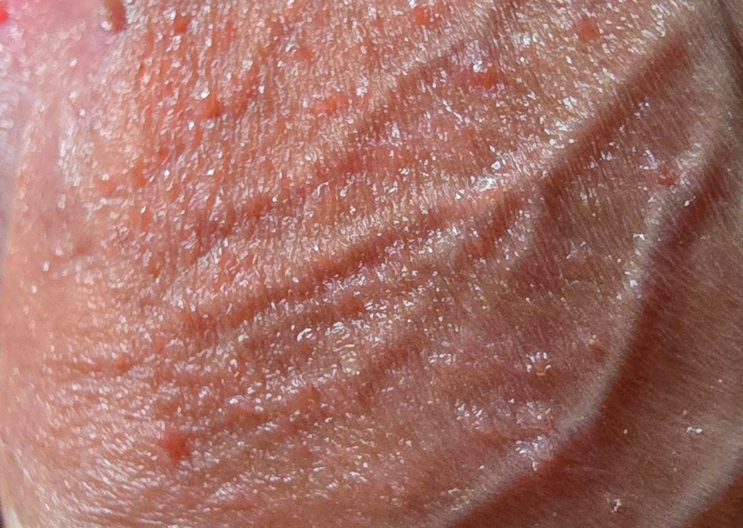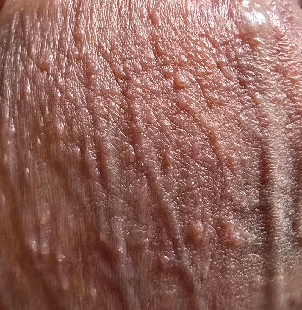 오히려 정상 변이인 진주양 구진(성기 주변에 생기는 미세한 돌기)이나 피지선이 도드라진 상태(포다이스 반점), 또는 경미한 모낭·피지 관련 변화 가능성이 더 높습니다. 특히 균일한 크기의 작은 돌기들이 군집해 있고 증상이 없다는 점이 이쪽과 잘 맞습니다.