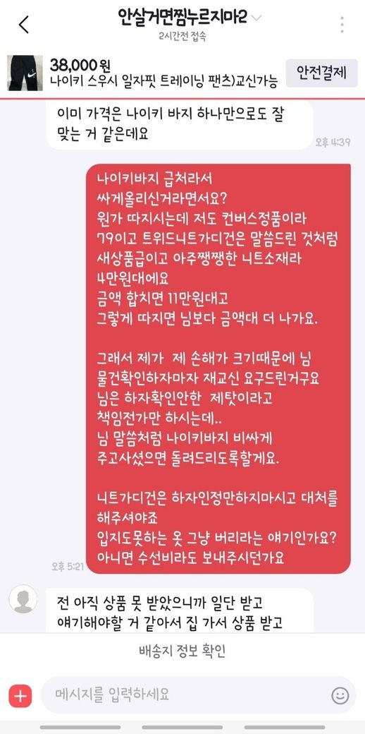 아무리 돈 거래가 아니라고 해도 엄연히 상품이 오고가는 교환거래인데, 옷 상태를 확인도 없이 보냈다고 느껴져서