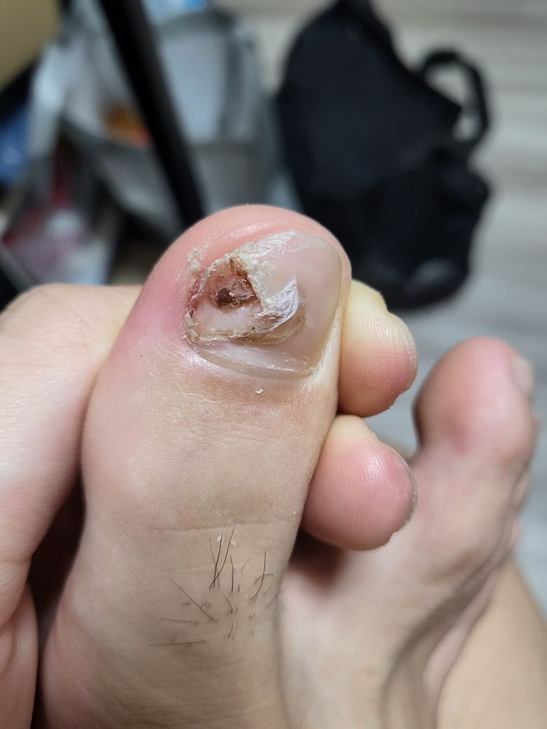 예전에 축구하다가 밟힌곳 좀 오래 피가 굳은거처럼 안에 있다가 시간이 좀 지나고 지금 발톱이 들려서 손톱깎이로 깎았는데 이 이후로 어떻게 해야하나요.