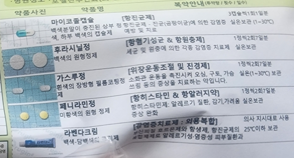 토요일에 병원에 다 문닫아서 연곳이 한구데밖에 없어서 갔는데요. 아래가 따끔하고 약간 간지러워서 방문했는데요. 후라시닐정과 마이코졸캡슐을 처방받았습니다. 세균감사도 했는데 5일후에 결과가 나온다고 하셨습니다. 마이코졸캡슐은 한번에 3알만 먹고 끝났는데. 후라시닐정은 2번먹은상태입니다.