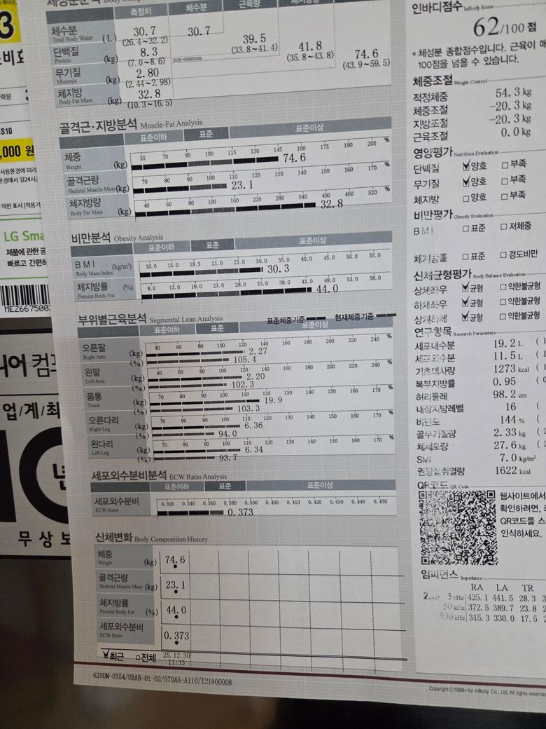 마운자로 제가 몸무게 76에 마운자로 시작했는데요, 처음에 인바디를 못하고 시작해서 2.5 mg3 주 맞고 보건소에 가서 인바디를 했어요. 그때 아래 인바디 결과고요. 5mg 4주차 오늘 맞고 인바디 가서 검사했는데요. 몸무게는