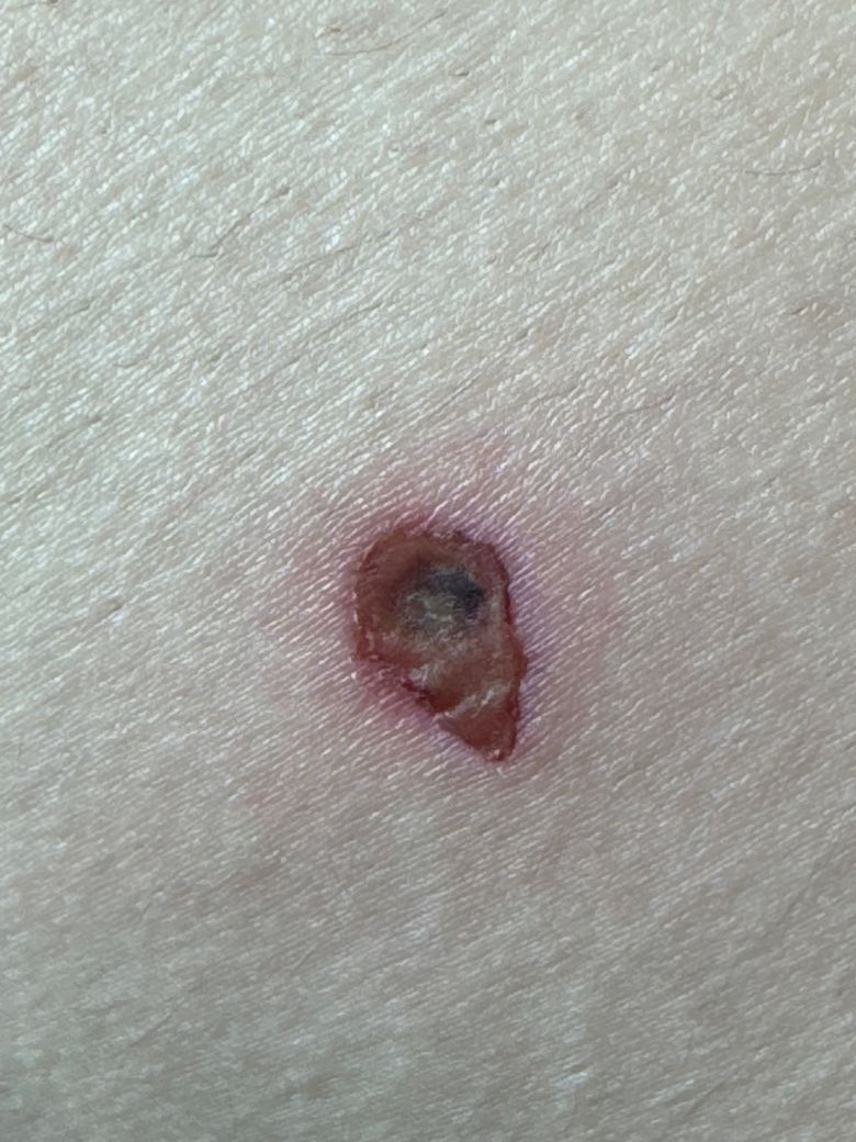 사진상 화상 부위 중심이 검게 변한 건 ‘딱지(괴사 조직) 형성’ 가능성이 높습니다. 깊은 2도 화상에서도 상처가 마르면서 이런 색 변화가 흔히 나타납니다.
