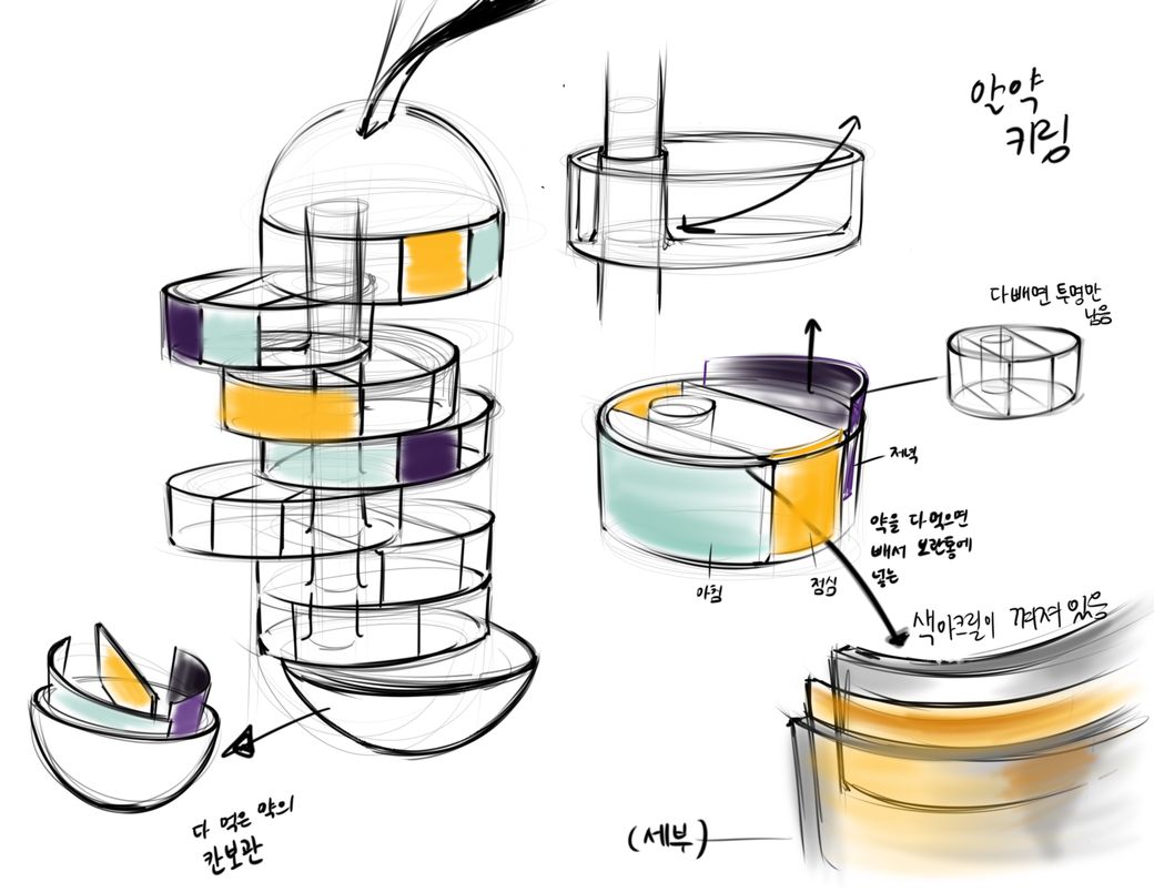 약을 보관하는 통을 디자인중으로 보입니다. 환자마다 케이스는 천차만별이겠습니다. 아점저/ 아저/ 아점저 자기전 등 하루에 몇번 복용하는지 환자마다 다르겠습니다. 또한 아침에도 아침식전, 식후로 나누어 복용하는 분들도 있겠습니다. 하루 한번만 복용하시다가 하루 2회로 늘어나는 경우도 있겠습니다. 마지막으로 조작과 휴대가 불편하다면 실용성이 떨어질꺼라고 예상됩니다.