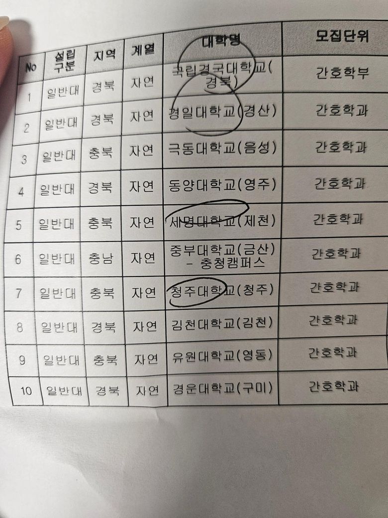 간호사가 꿈인 고 3 학생입니다 제가 사진에서 10개의 대학중에 6개를 정하려하는데 주변 인프라,통학,인지도,교육 수준,국가고시 합격률 등등 생각하면 어떤 대학을 택하는게 좋을까요