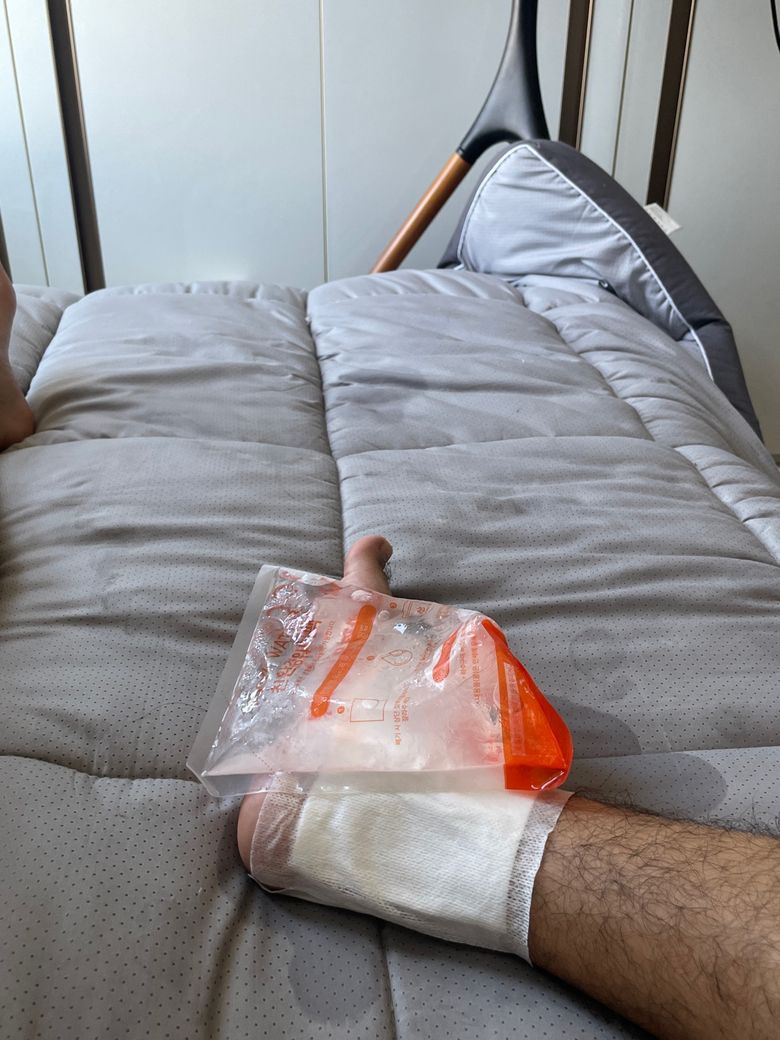 현재로썬 냉찜질과 다리를 좀 더 높은곳에 올려서 휴식을 취하시길 바랍니다.