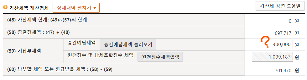 아니면 기납부세액에 직접 30만원을 입력해서 총 -70만원 정도 되어야 맞는 건가요?
