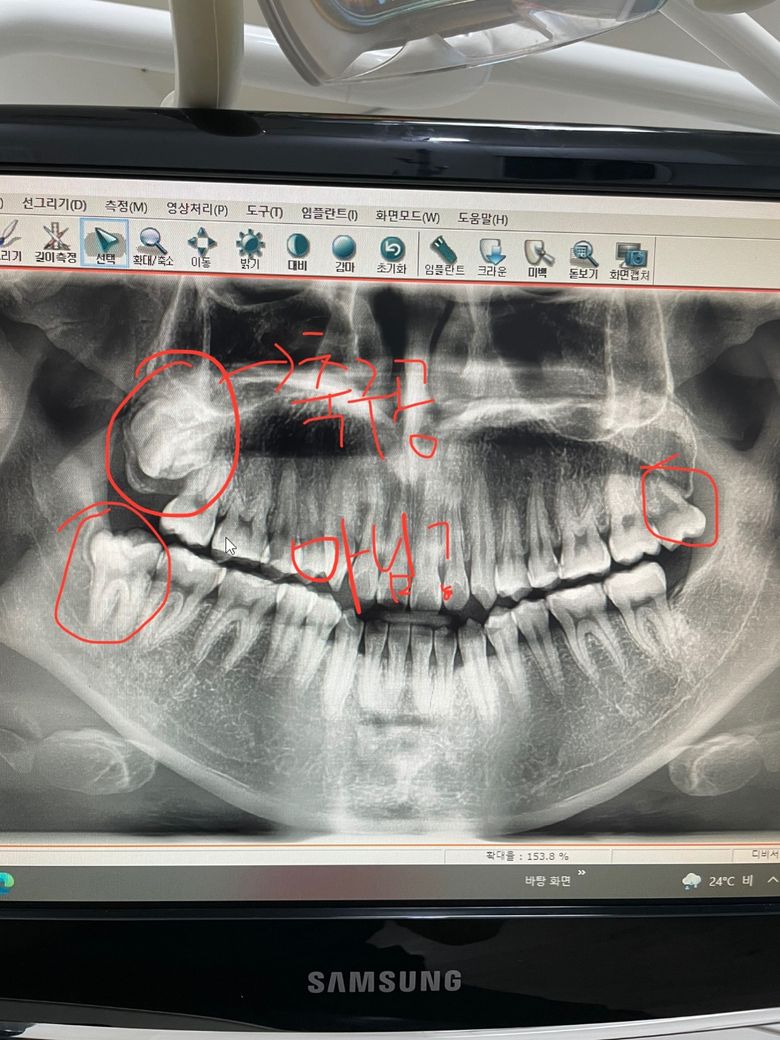 나머지 치아는 발치를 하는데 크게 어려움이 있지는 않으나 오른쪽아래 사랑니의 경우에는 사랑니의 뒷편에 치조골이 있어 발치를 하는 데 시간이 좀 걸릴수 있습니다.