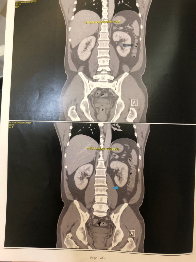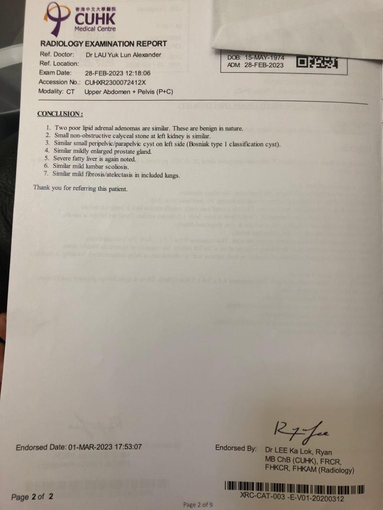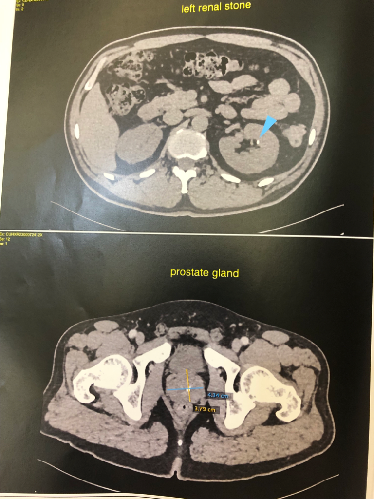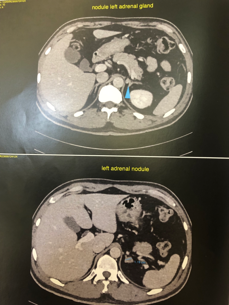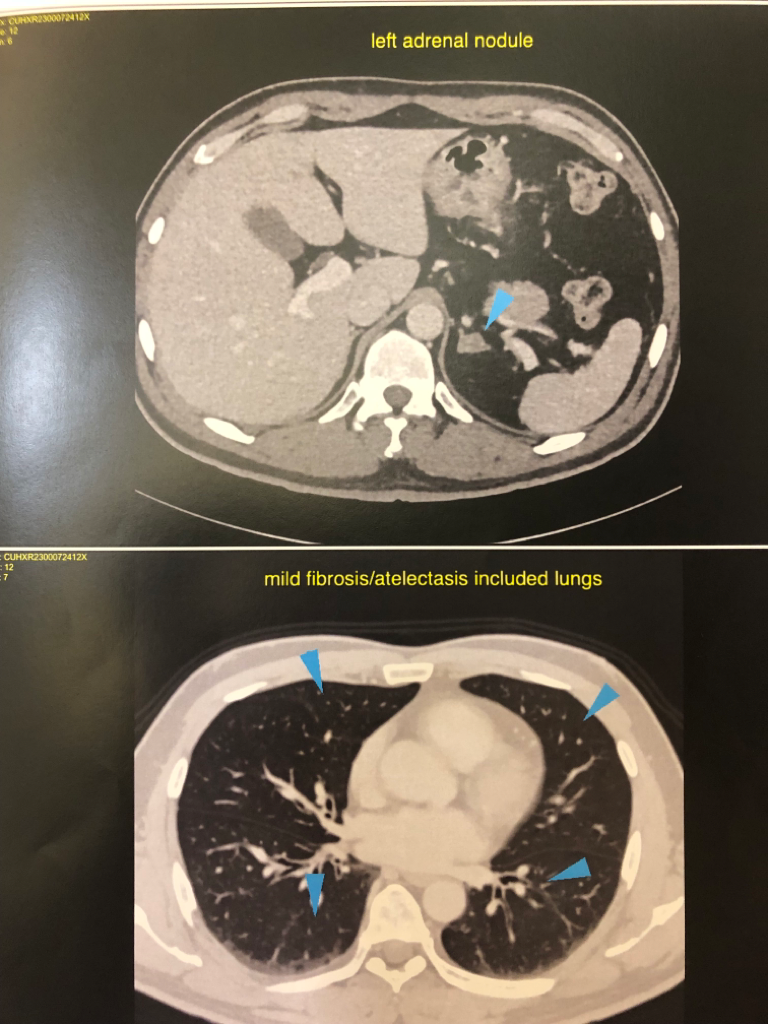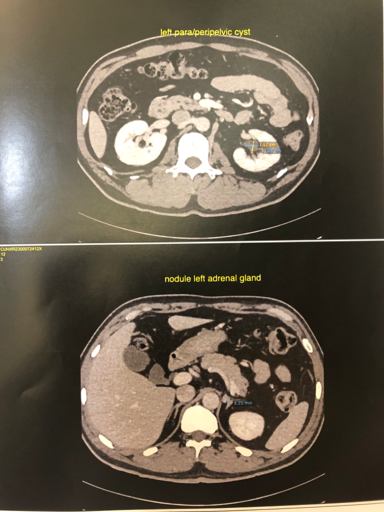 양쪽 부신에 낭종이 있고, 신장에 결석인지 물혹인지가 있고 폐 석회화,경증의 전립선 비대 등등이 있다고 알고 있는데요