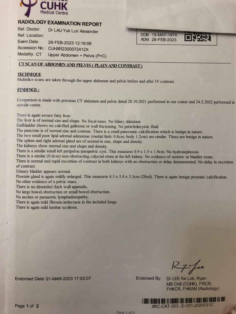 췌장도 정상이라고 판독지에 언급이 되어 있습니다. 설명이나 판독이 불안하시다고 생각이 되면 CT 파일 전체를 가지고 다른 영상의학과 선생님께 재판독을 의뢰하는 방법이 있습니다만(사진이 굉장히 여러장이고 올리신 사진이 일부이기 때문에) 해외시면 쉽지 않은 방법으로 생각됩니다.