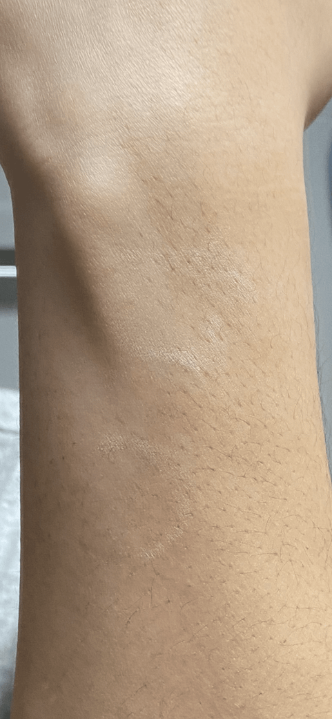 오늘 아침 손목쪽이 유독 간지럽더니 확인해보니까 흰색 도넛 모양으로 이상한 게 두개가 생겼네요... 처음에 엄청 간지럽더니 이제는 아무렇지 않긴한데 저 모양은 아직도 그대로 있네요 무슨 증상인가요??
