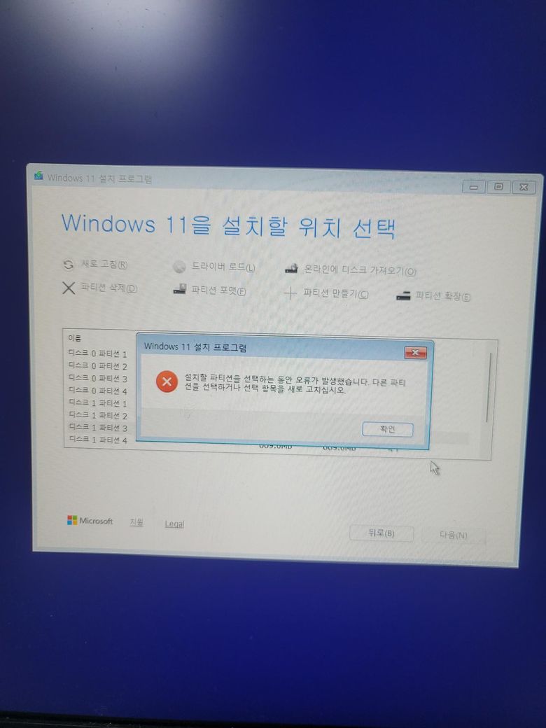 해당 오류 메세지는 선택한 파티션이 기존에 윈도우 설치 파일나 복구 파일이 남아 있는 경우나 파티션 형식과 윈도우 모드가 맞기 않기 때문에 나타날 수 있습니다. 가장확실한 방법은 설치 대상 디스크의 기존 파티션을 모두 삭제하는 것이 좋게 새롭게 파티션을 생성해서 설치하는 것이 정확합니다.