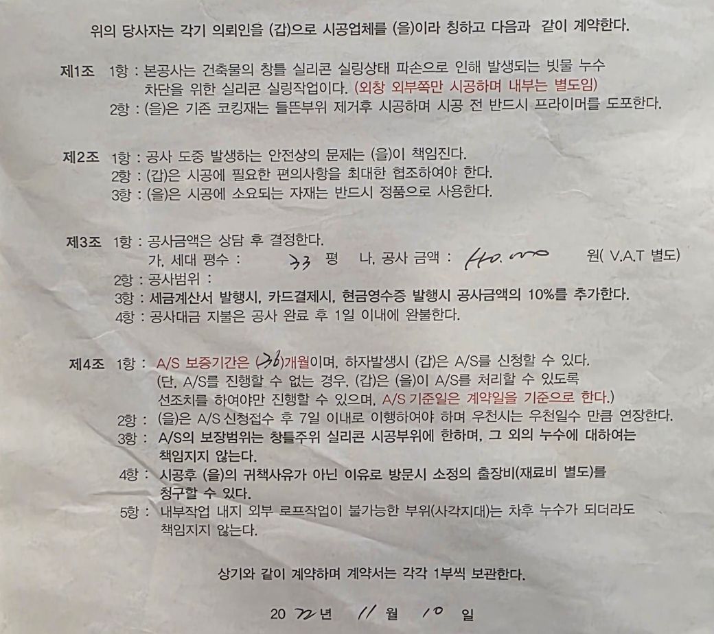 이런 상황에서 2년 9개월 전에 시공한 업체에 AS를 요규 하려 하는데 저는 코킹 재시공뿐만 아니라