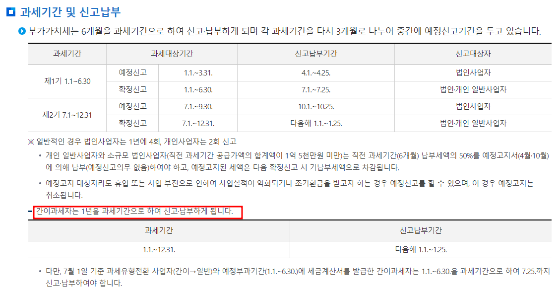 일반과세자 : 1~6월 매출/매입분 => 7.1~7.25까지 신고, 7~12월의 매출/매입분=> 다음연도 1.1~1.25까지 신고
