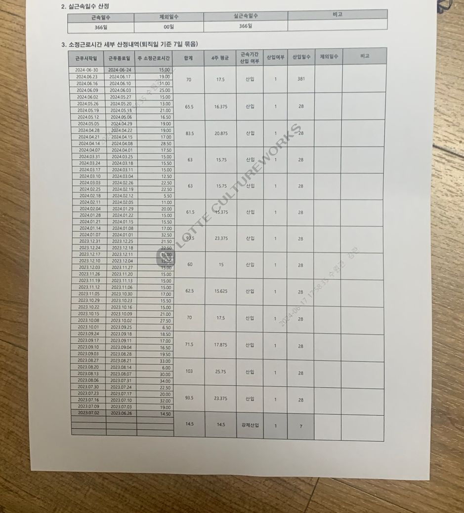 주에 몇 시간이 딱 고정된 것이 아니라 사진 같이 주마다 스케줄이 다른데 이렇게 되면 계산이 (직전 4주간 소정근로 + 주휴 + 대휴)/28시간으로 알고 있는데 그렇다면 제 1일소정근로시간은 어떻게 되는 건가요??