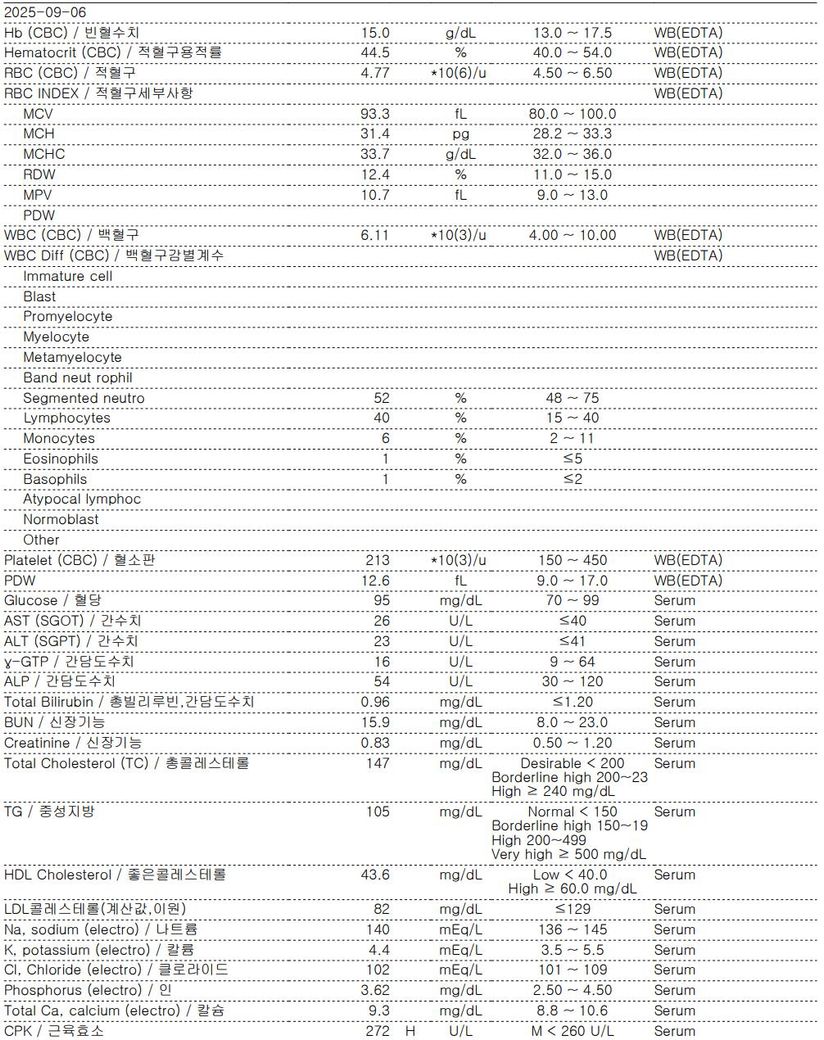 다른 수치는 전부 정상인데 림프구가 40, CPK 근육효소라는 수치가 272가 나왔는데