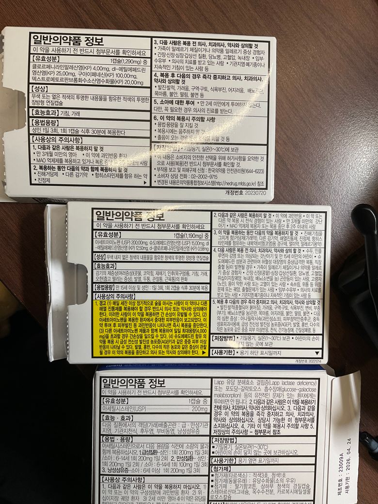 지금 보여주신 기침감기약(푸푸에프), 코감기약(비비코에스) 모두 항히스타민 성분이 들어있어서