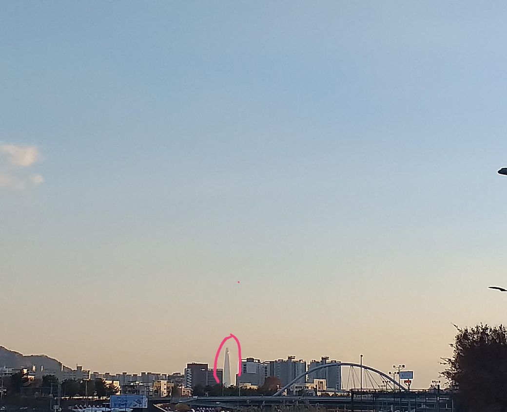 안녕하세요. 사진상에 나와 있는 빨간색으로 동그라미 친 것은 롯데 타워가 맞습니다. 딱 봐도 다른 빌딩에 비해 상당히 많이 크고 흐릿하지만 그래도 롯데 타워가 확실해 보이네요.