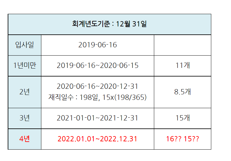 - 2019.6.16.~2020.5.15(1년 미만): 1개월 개근시 1일의 월단위 연차휴가 발생(7.16/8.16....20.5.16에 1일씩 총 11일 발생).