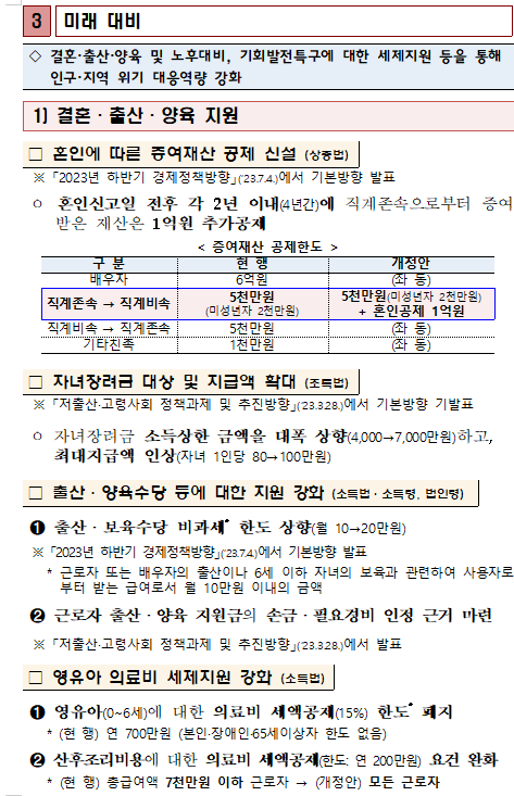 상세본 말고 세법개정안을 보시면 요약본으로 내용이 나와있으니 참고하시면 됩니다. 결혼/출산/양육지원 등의 미래대비 세법안이 가장 현실적으로 와닿을 것으로 보여집니다.