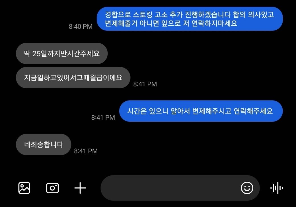 집언제들어가냐 등등 이런 협박을 하였고 싫다 차단하겠다 했음에도 차단전화로 5번넘게 와서 스토킹 협박으로 고소넣겠다 예고한 상태입니다