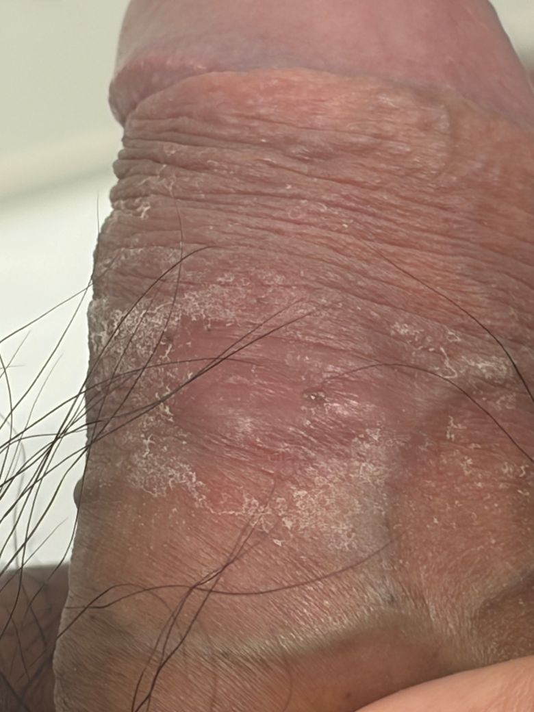사진상 병변은 성기 기둥 피부에 국한된 홍반과 약간의 각질, 중심에 작은 모공처럼 보이는 점이 있는 형태입니다. 군집된 물집, 깊은 궤양, 사마귀 형태는 보이지 않습니다. 이러한 양상은 성병에서 흔한 병변보다는 피지선 또는 모낭 주변 염증에 더 가까운 모습입니다.