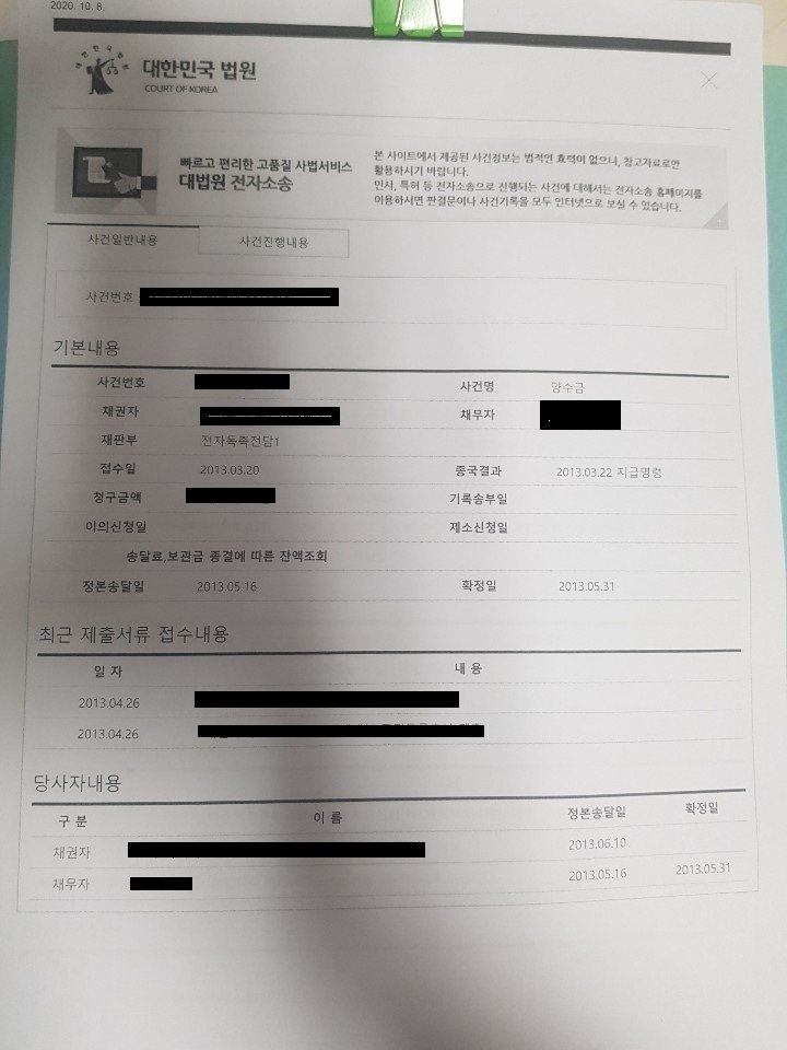 질문하신 내용에 대하여 아래와 같이 답변 드립니다.종국결과에 2013. 3. 22. '지급명령'이라고 기재가 되어 있고, 아래 쪽에 확정일 ' 2013. 5. 31.'로 기재된 것으로 보아 지급명령이 확정되어 사건이 종결된 것으로 보입니다.