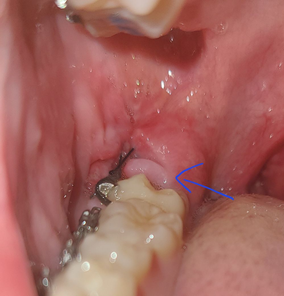 저번주 금요일에 오른쪽 아래 매복사랑니를 발치했습니다. 일요일까진 안 이랬던거 같은데, 월요일날 아침에 일어나서 보니 화살표 친 부분의 잇몸이 갈라진 형태처럼 보이게 되었습니다. 혹시 실밥이 풀린건가요? 그 부위에 통증은 전혀없고, 처방받은 가글,물 음식물이 닿아도 따갑거나 아프진 않습니다. 이번주 토요일에 실밥제거를 하기로 되어있고 사정상 토요일까지 발치한 치과에 방문하기 어려운데, 치과에 방문하지 않아도 되는 문제인가요?