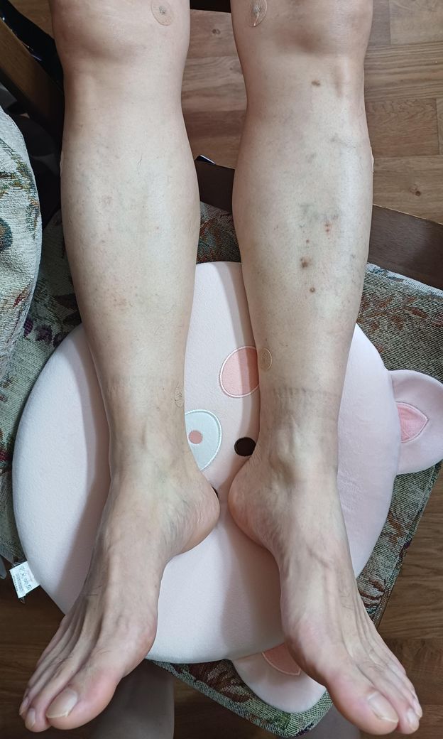 양다리 다 쥐가 많이 나지만 특히 왼쪽 다리 앞쪽에 증상이 심하세요. 발 끝이 보라빛으로 변할 때도 있습니다.