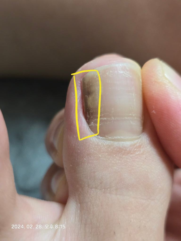 가능성을 전혀 배제할 수 없지만 흑색종일 가능성이 높아 보이지는 않습니다. 무좀이나 다른 질환에 의해서도 생길 수 있는 소견이며 관련하여서는 피부과적으로 진료 및 치료를 받으시길 권고드립니다.