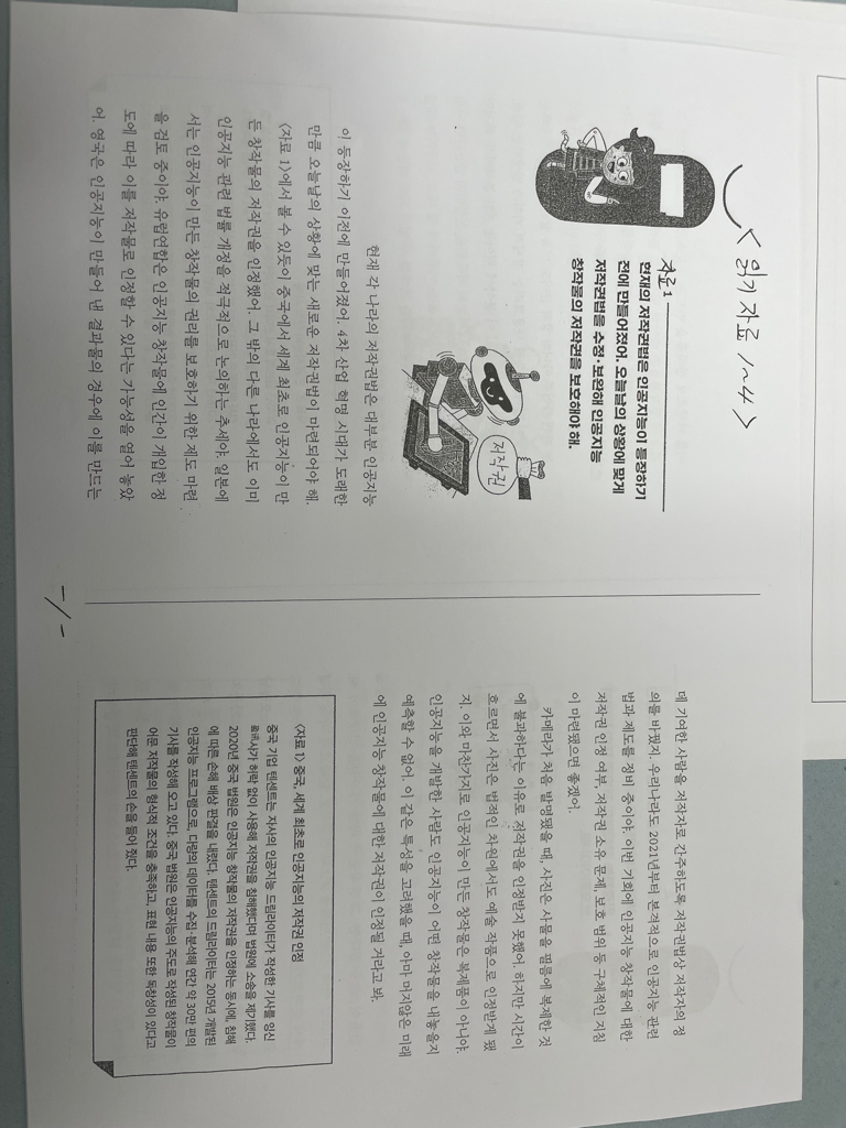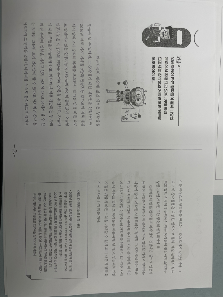 첨부해주신 내용은 잘 읽어봤습니다.일단 인공지능을 통한 창착물의 저작권에 대한 찬성과 반대, 또는 어떤 입장인지를 말하는 토론으로 생각됩니다. 첨부해주신 자료는 인공지능을 활용하여 만든 창막물의 저작권은 엄연히 존재를 하며 각국에서 벌써 논의가 되었고 중국 같은경우는 벌써 저작권이 인정됩니다. 역시나 저역시도 개인이 인공지능을 통해 만든 저작권은 인정되어야 한다는 입장이며 자료에서의 논거는 과거의 저작권이 인정받지 못했던 사진의 역사와 만약 저작권 인정이되지 않는다면 인공지능 개발자들이 개발을 하지 않을것 이란 걸 논거로 두고 있습니다.